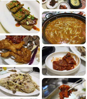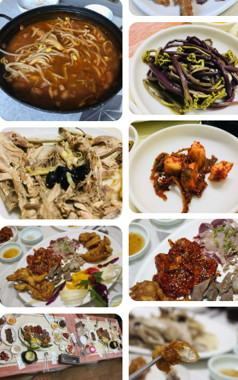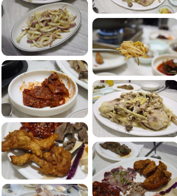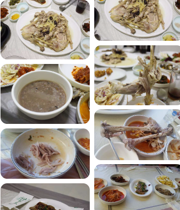 - 닭사시미 → 닭튀김 → 닭내장 요리 → 백숙 → 칼국수 → 영양죽까지 풀코스 제공.