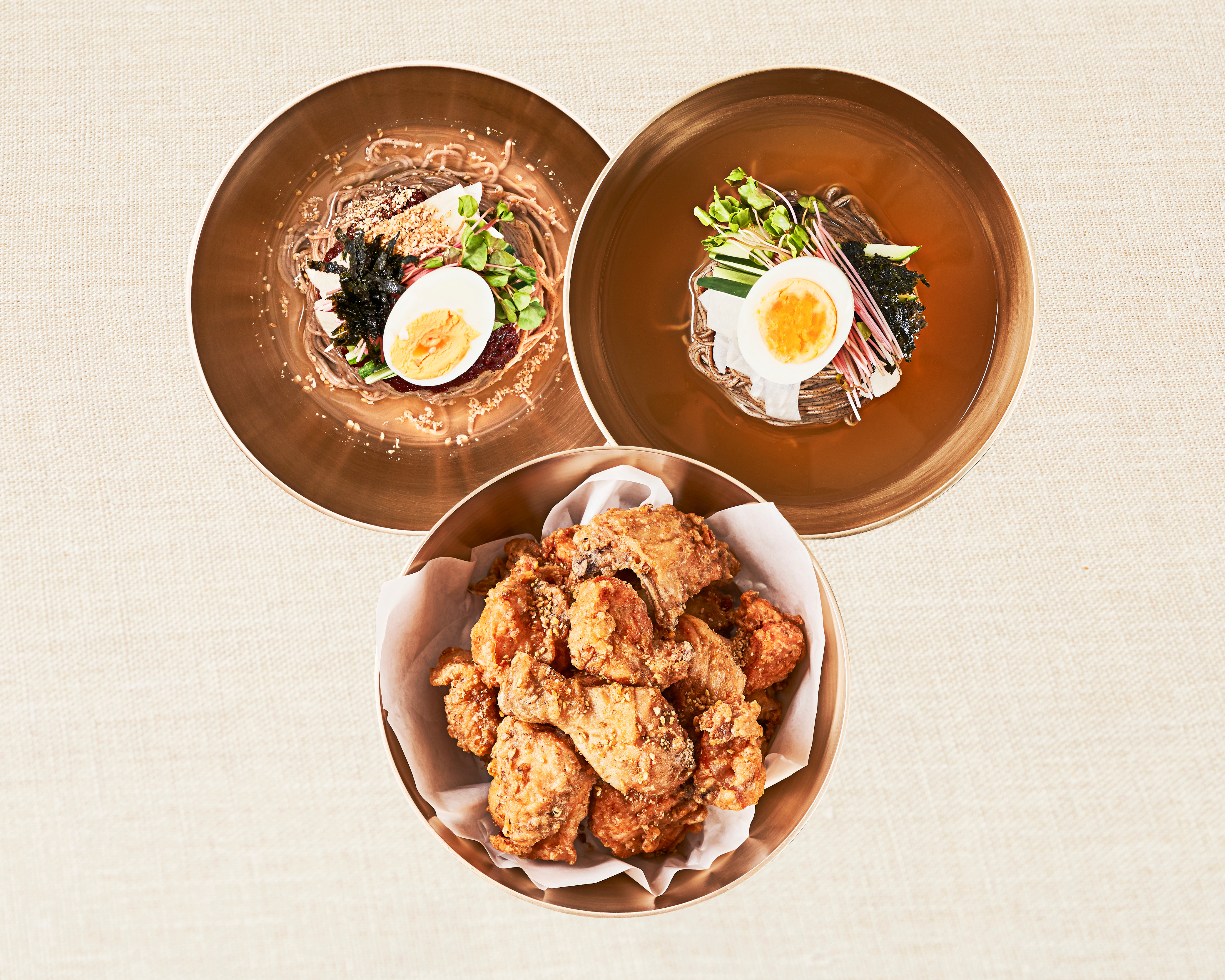 메밀 반죽으로 바삭하게 튀긴 닭튀김과 막국수를 함께 즐길 수 있는 세트