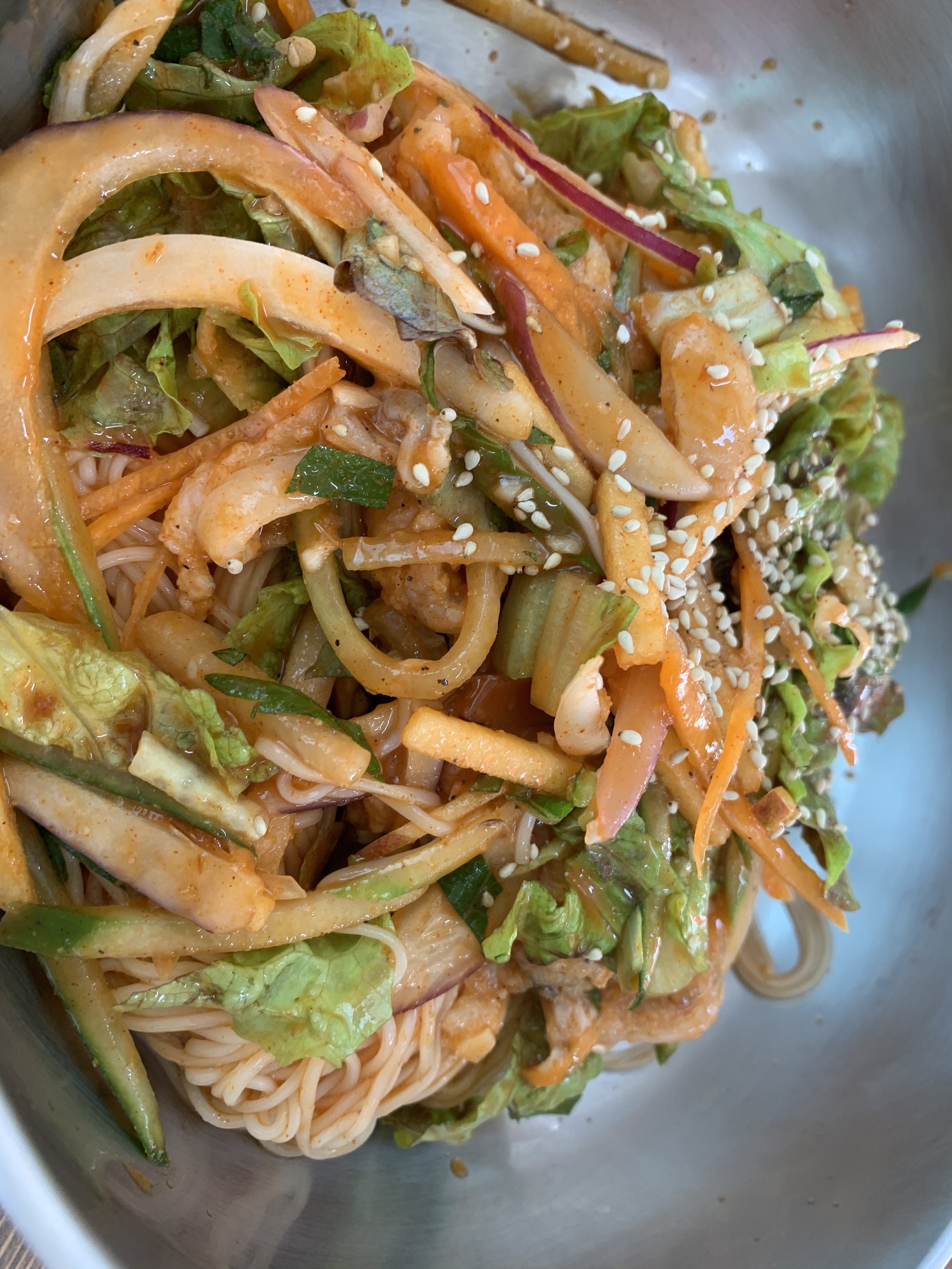 - 면 위에 회무침, 채소(상추, 당근, 자색 양파) 등 다양하게 올려져 비주얼부터 푸짐!